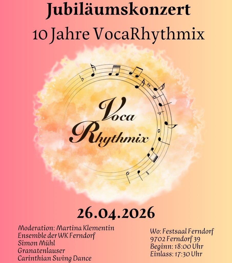 Am 26. April 2026 um 18:00 Uhr im Festsaal Ferndorf laden wir herzlich zum großen Jubiläumskonzert ein. Freut euch auf eine mitreißende Show voller BodyPercussion, kraftvoller Stimmen und purer Spielfreude – ein Abend, der garantiert unter die Haut geht.